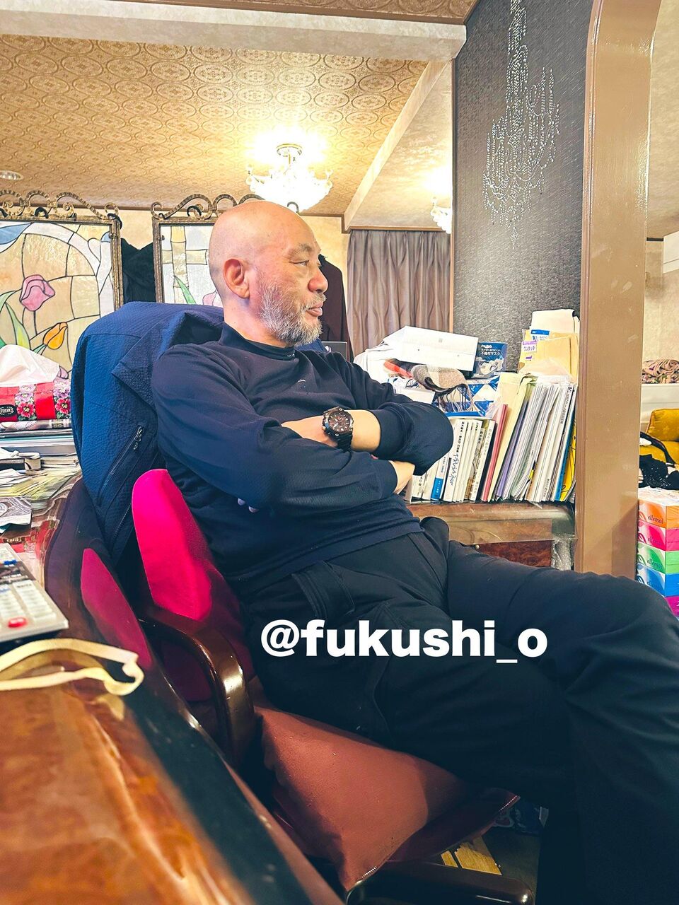福嗣は「横浜vs阪神の試合を観る石像」と題して腕を組み、椅子でリラックスした様子も鋭い眼光の博満さんの姿を投稿。
