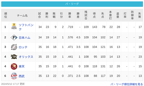 ソ – オ#lovefighters #RakutenEagles #seibulions #chibalotte #Bs2024 #sbhawks pic.twitter.com/ujg3wWPxLW— パ・リーグ.com / パーソル パ・リーグTV【公式】 (@PacificleagueTV) May 12, 2024