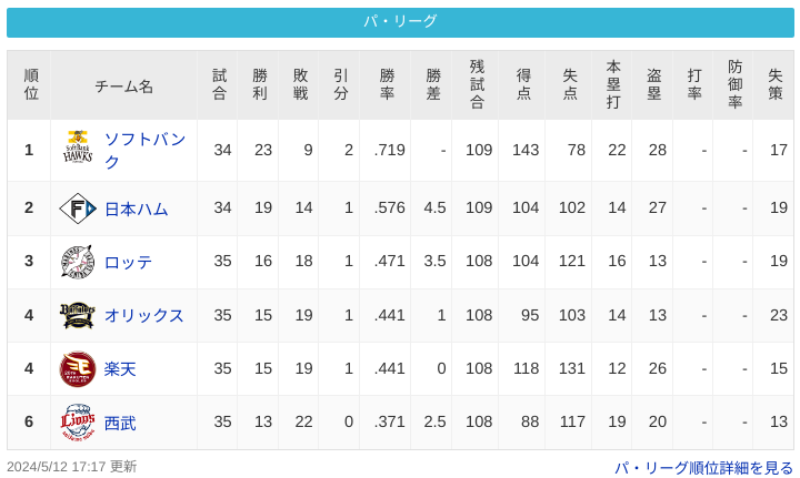 パーソル パ・リーグ 順位表 (5/12)⚾️