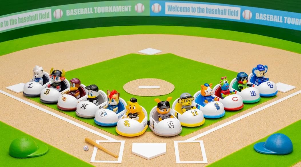 プロ野球とトミカのコラボ商品が登場!特徴的な12球団マスコットが、球団のロゴがデザインされたオリジナルカーで球場に入場するような雰囲気を表現しています。マスコットのフィギュアは手足が可動する仕様で、マスコットカーから乗り降りさせることもできます。今年はビジターユニフォーム版となっています。
