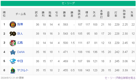 【5/12】神-巨=-/広/=-横中-ヤ【順位スレ】 スポンサーリンク 中日ドラゴンズ 2024/05/13 08:04 【5/12】神-巨=-/広/=-横中-ヤ【順位スレ】 (出典 ●●●東京●●中日●●横浜 広島 読売○○○阪神○○○○) 1 それでも動く名無し 警備員[Lv.33][苗] :2024/05/12(日) 21:27:12.97 ID:01xSqPKmd 阪神○○○○ 読売○○○ 広島 横浜●● 中日●● 東京●●● 福岡○○○○○○○○○○○○○○ 日公○○○○○ 千葉●● 檻牛●●●● 楽天●●●● 西武●●●●●●●●● (出典 ●●●東京●●中日●●横浜 広島 読売○○○阪神○○○○) 続きを読む