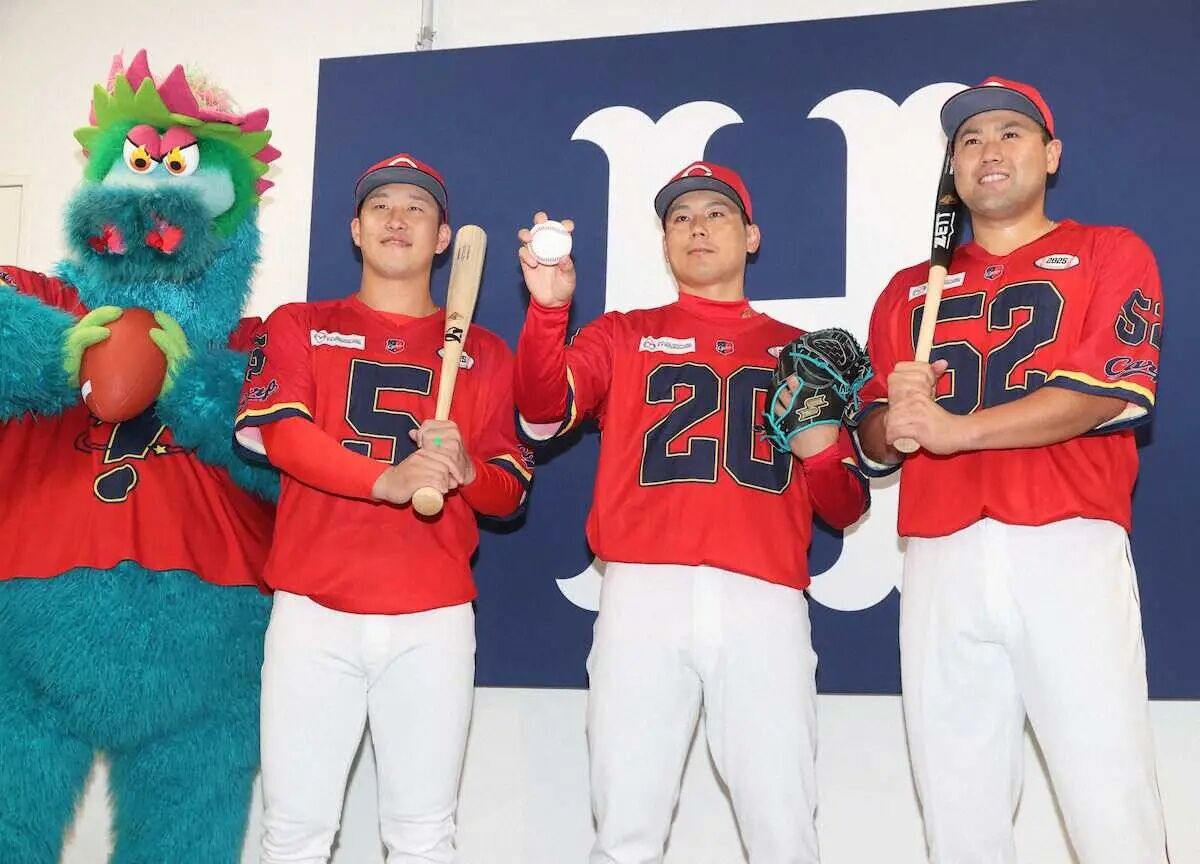 広島は8日、8月1日~3日の中日戦(マツダ)、8月22日~24日の中日戦(マツダ)6試合限定で着用するアメフト風デザインユニホームをお披露目した。