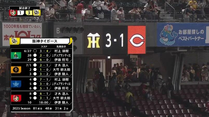 【広島対阪神14回戦】阪神が2023年以来2年ぶりの10連勝!先発の大竹耕太郎が今季5勝目!佐藤輝明は今季22号弾!