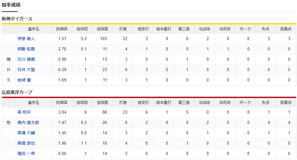 カープ、阪神に痛恨の3連敗で11連勝献上。秋山逆転2点タイムリーも島内&森浦5失点炎上で3位転落【広島3-6阪神/試合結果】