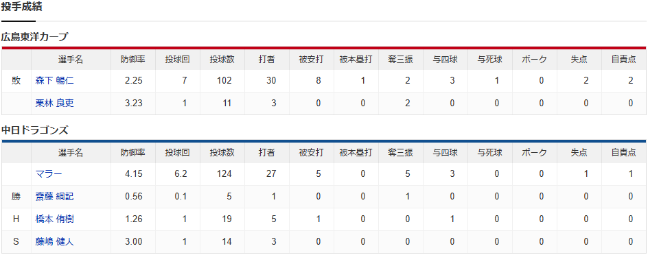 カープ森下7回2失点も12球団ワースト9敗目。ファビヘッスラ同点打&強肩発動!ケンティー好守!坂倉マルチ!同点好機に一打出ず4連敗【広島1-2中日/試合結果】