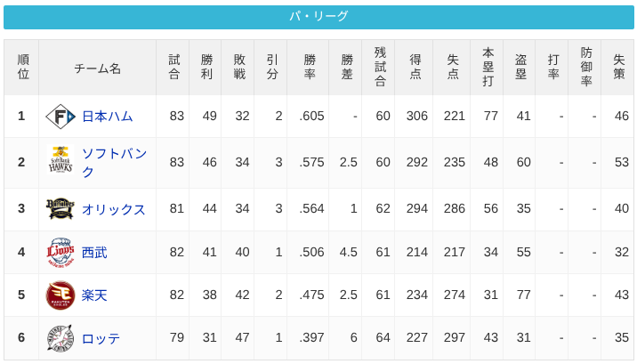 パ・リーグ 順位表 (7/13)