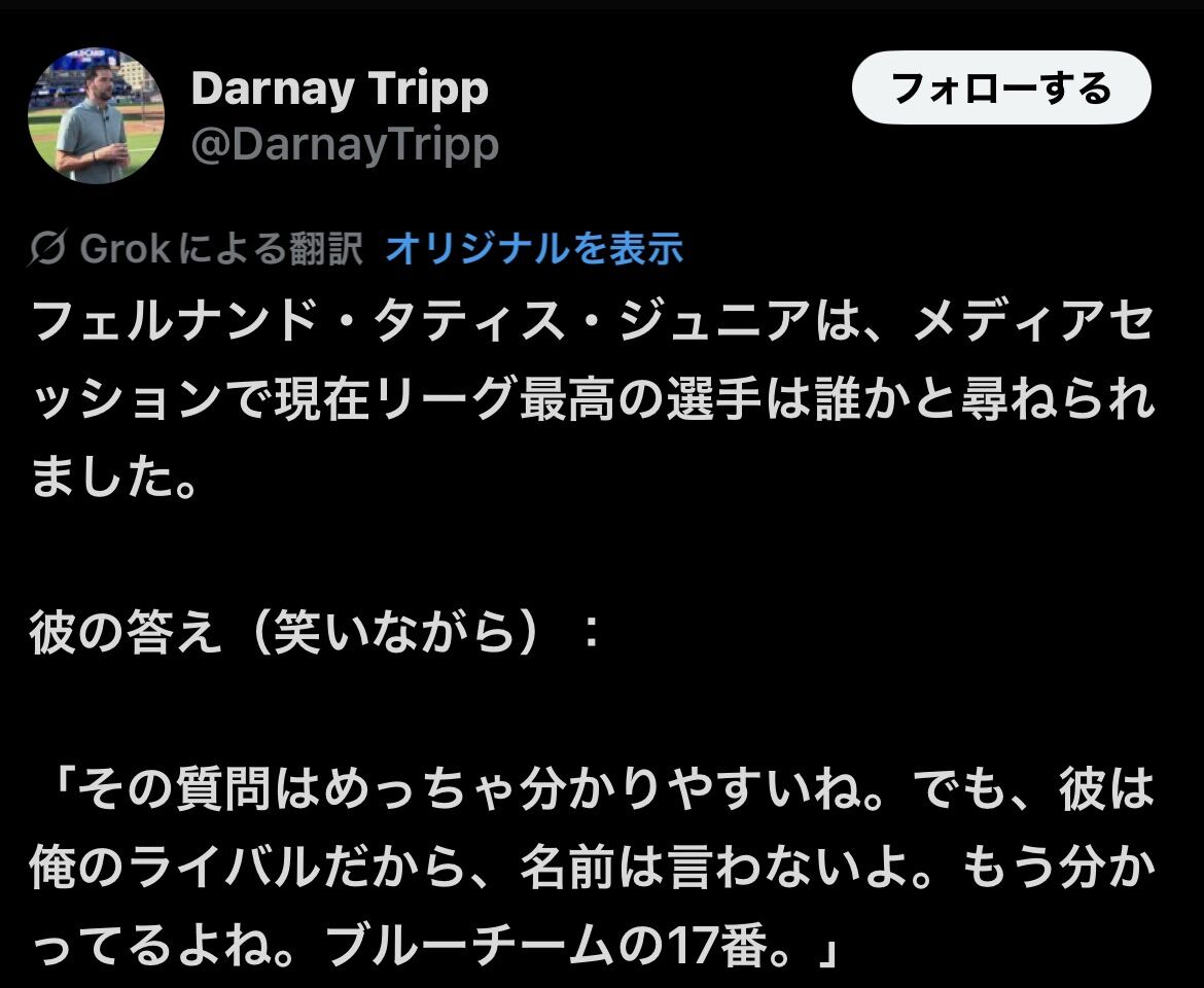 【MLB】タティスJr.「リーグ最高の選手?名前は言わないけどブルーチームの17番だねw」