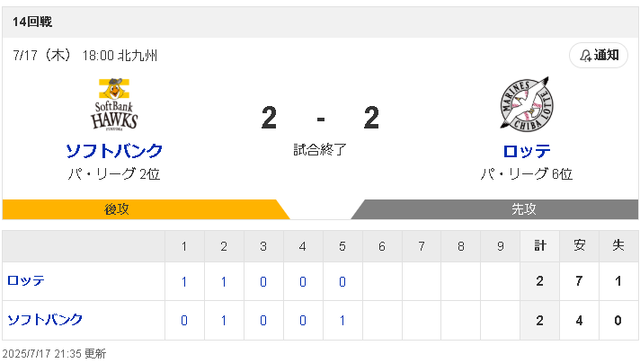 【悲報】SBロッテ雨天コールド引き分けwwwwwwww
