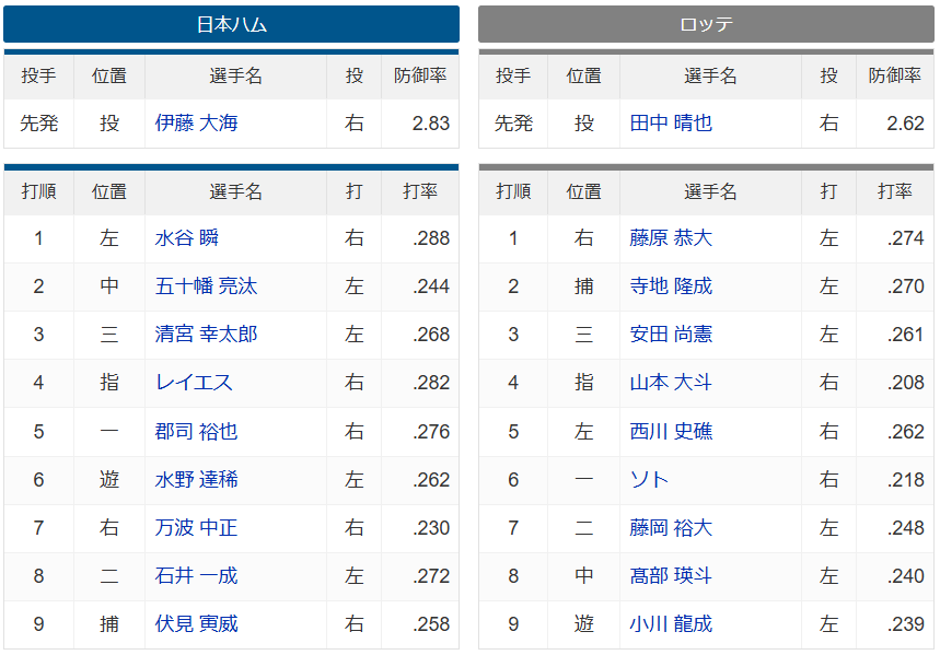 【日本ハムvs.ロッテ 14回戦】1(左)水谷瞬 2(中)五十幡亮汰 3(三)清宮幸太郎 4(指)レイエス 14:00〜