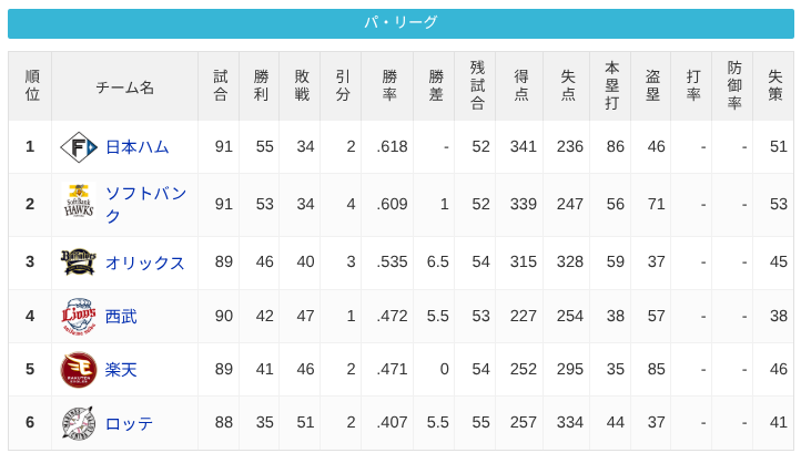 パ・リーグ 順位表 (7/27)