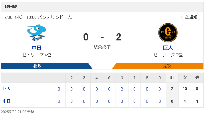 【7/30 D0-2G】中日 4安打完封負けで自力優勝消滅…阪神にM39点灯