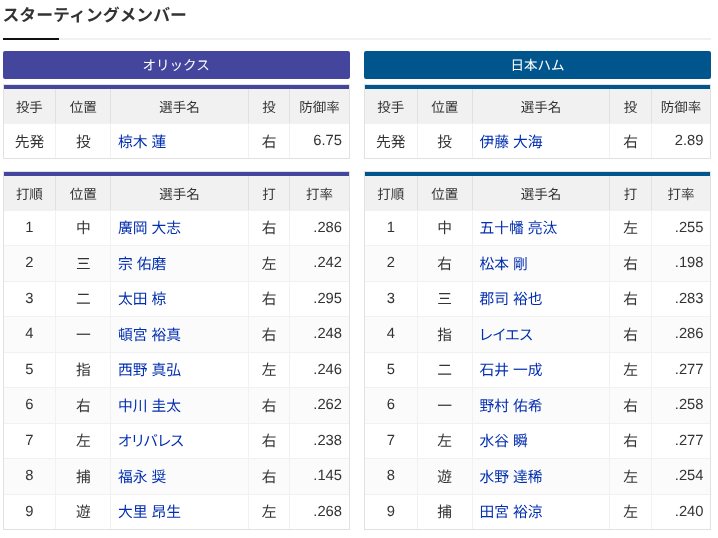 【オリックスvs.日本ハム 18回戦】1(中)五十幡亮汰 2(右)松本剛 3(三)郡司裕也 4(指)レイエス 13:00〜