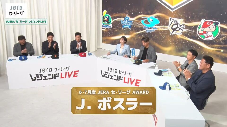 ボスラーは6、7月、打率3割1分、4本塁打、18打点。この期間に8本塁打、20打点だった阪神・佐藤輝や、5試合で4勝1敗だったDeNA・東らもノミネートされたが、7月13日の広島戦(バンテリンドームナゴヤ)や同31日の巨人戦(同)でサヨナラ犠飛を放ち、同29日の巨人戦(同)では逆転3ランを放つなど勝利に貢献したことが考慮され、6、7月度の月間大賞に選ばれた。鳥谷さんは「中日が上がってきた一つの要因はボスラー選手の活躍が大きい。試合を決める打点も多い」と評価し、川上さんは「日本の配球を勉強しているのか、今までだったらすぐ追い込まれていたのを、自分の有利なカウントに持っていける。今は読みが当たっている」などと語った。