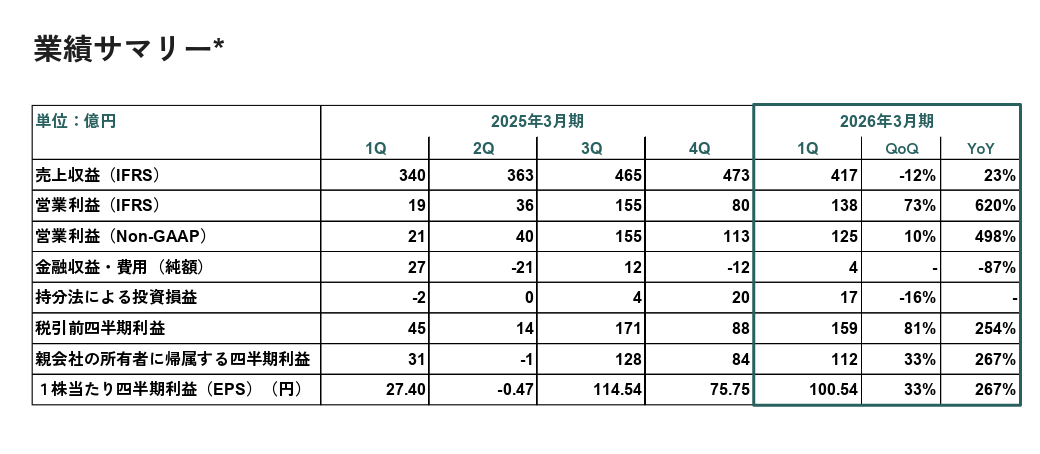 ディー・エヌ・エーは8月7日、2026年3月期第1四半期(4月1日~6月30日)の決算結果を発表した。売上収益は417億2700万円(前年同期比22.8%増)、営業利益138億円(同620.0%増)、税引前利益158億7100万円(同253.6%増)、親会社の所有者に帰属する四半期利益112億300万円(同267.1%増)となった。