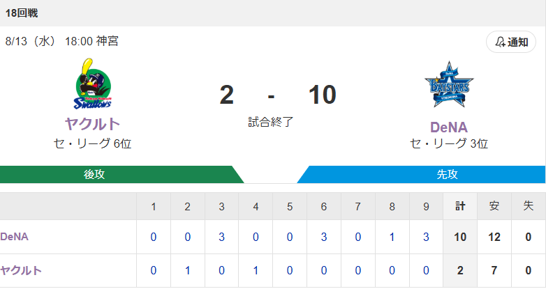 【試合結果】ヤクルト2-10ベイスターズ 北村山田にHR アビラ小澤阪口が3失点