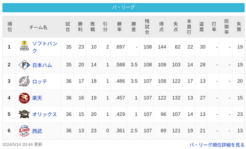 パーソル パ・リーグ 順位表 (5/14)⚾️