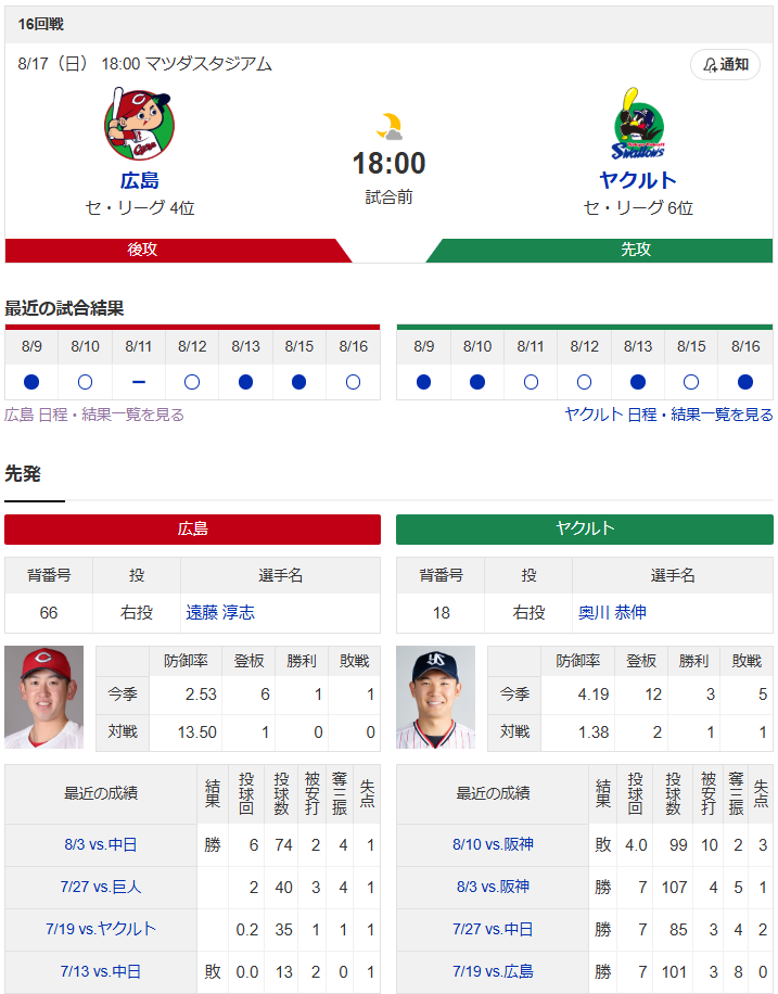 2025年8月17日 広島東洋カープvs.東京ヤクルトスワローズ - プロ野球 - スポーツナビプロ野球 セ・リーグ 広島東洋カープvs.東京ヤクルトスワローズの試合のスコア、結果、成績、動画など最新情報をお届けします。
