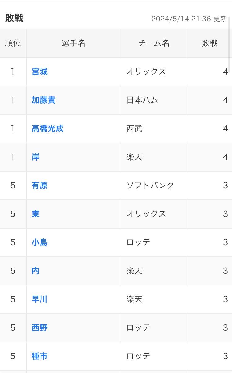 パ・リーグ投手敗戦ランキングワーストが有能揃い