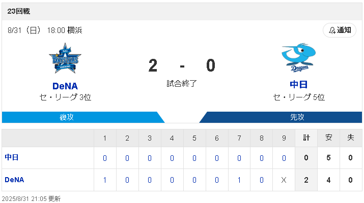 【8/31 D0-2DB】中日、DeNA藤浪対策で左8人打線を組むもを打ち崩せず連勝ストップ!
