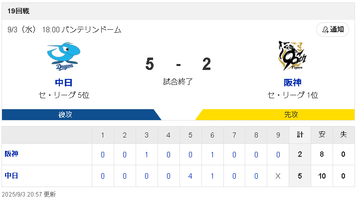 阪神 0 0 1 0 0 1 0 0 0 |2