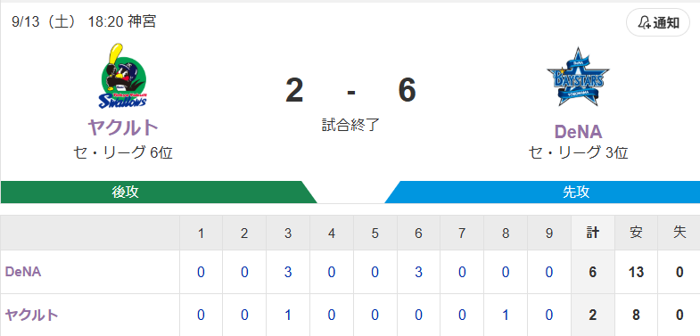 【試合結果】ヤクルト2-6ベイスターズ 山野6回途中6失点 濱田村上タイムリー