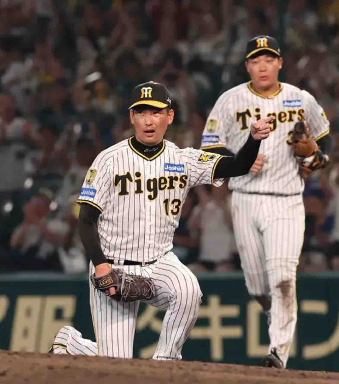 2-1の九回に登板した阪神・岩崎優投手(33)は2四球で2死一、二塁のピンチを招いたが、佐野を一ゴロに打ち取って、力強くガッツポーズ。