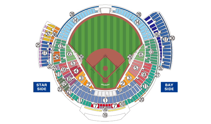 「2025 JERA クライマックスシリーズ セ」では、レフト外野エリア全てをホーム外野指定席として販売いたします。それにともない、ビジター応援エリアは、レフト外野エリアではなくウィングエリア(STAR SIDE)を「ビジターウィングフロント席/ビジターウィング席(下図36,37)」として販売いたします。あらかじめご了承ください。