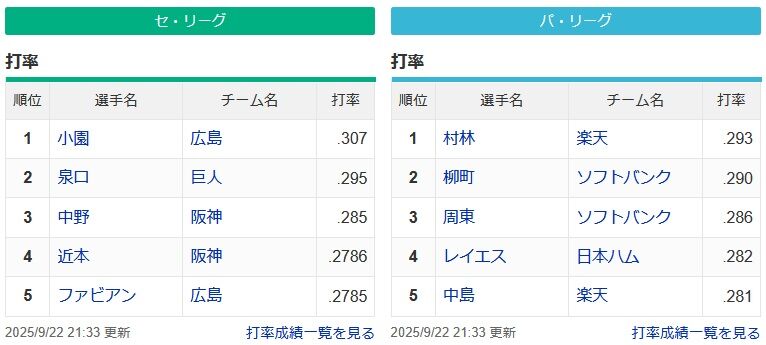パ・リーグ首位打者 村林 .293 3割打者は0人に セ・リーグは3割1人