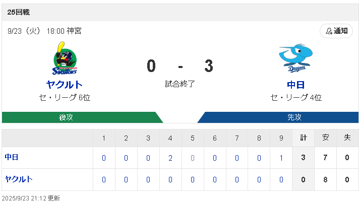 ヤクルト 0 0 0 0 0 0 0 0 0 |0