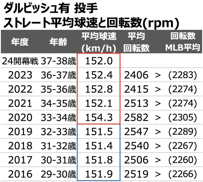 ダルビッシュ有 投手 MLBでのストレート平均球速と回転数