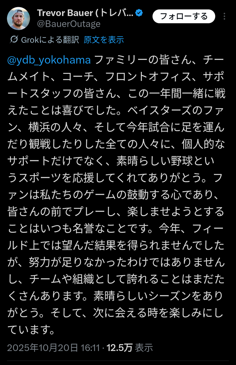— Trevor Bauer (トレバー・バウアー) (@BauerOutage) October 20, 2025