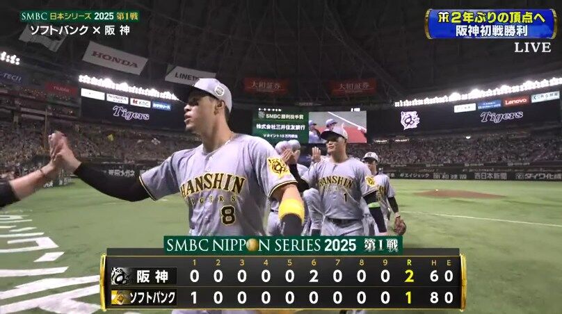 【日本シリーズ第1戦】阪神が鮮やかな逆転勝ちで先勝! 主砲・佐藤輝明が決勝打、村上頌樹が7回1失点の好投