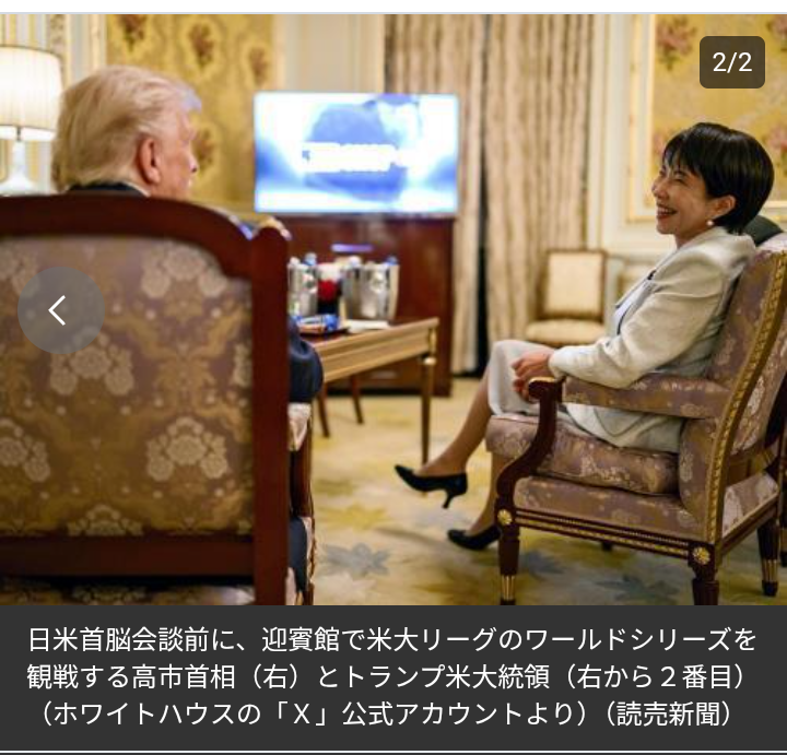 会談冒頭、高市首相は予定より会談開始が遅れたことをわび、「今、トランプ大統領の部屋で野球を見ていた。(現在)ドジャースが1対0で勝っている」と明かして同席者の笑いを誘った。