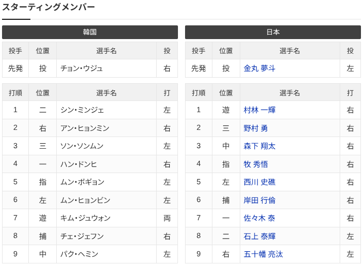 【侍ジャパンvs.韓国】9(右)五十幡亮汰 19:00~ スポンサーリンク 北海道日本ハムファイターズ 2025/11/17 00:44 【侍ジャパンvs.韓国】9(右)五十幡亮汰 19:00~ 【ラグザス 侍ジャパンシリーズ2025⚾】11/16(日)19:00~🏟東京ドーム韓国🇰🇷 – 🇯🇵日本 日本スタメン▼先発 #金丸夢斗1(遊)#村林一輝2(三)#野村勇3(中)#森下翔太4(指)#牧秀悟5(左)#西川史礁6(捕)#岸田行倫7(一)#佐々木泰8(二)#石上泰輝9(右)#五十幡亮汰#侍ジャパン — 週刊ベースボールONLINE (@BaseBallMOnline) November 16, 2025 続きを読む