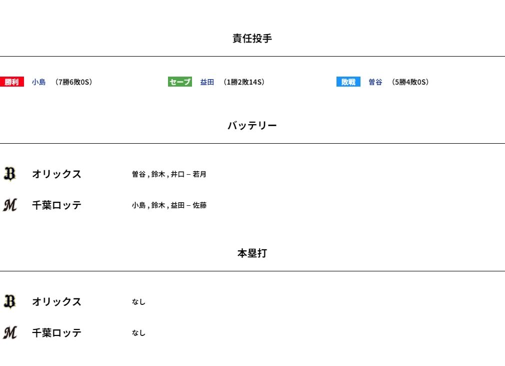 7月12日 ロッテ1-0オリックス 先発小島が7回無失点の好投!三度ピンチをしのぎ接戦制しBSW初戦を白星で飾る!