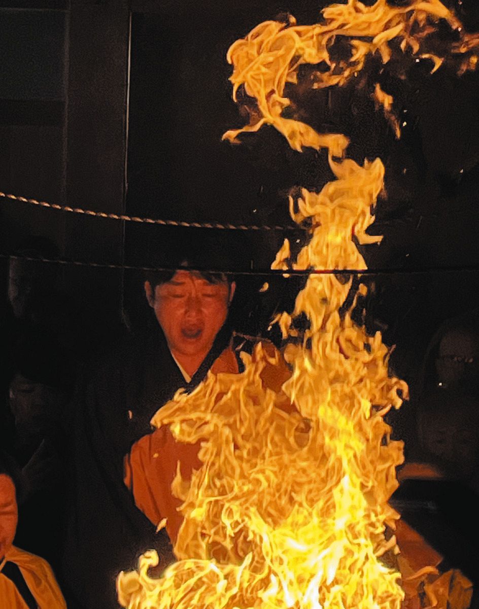 眉毛とまつげはもう防波堤の意味を成していない。額からとめどなく伝う汗と目の前の護摩木から巻き上がる熱波と煙。高さ最大3メートル、