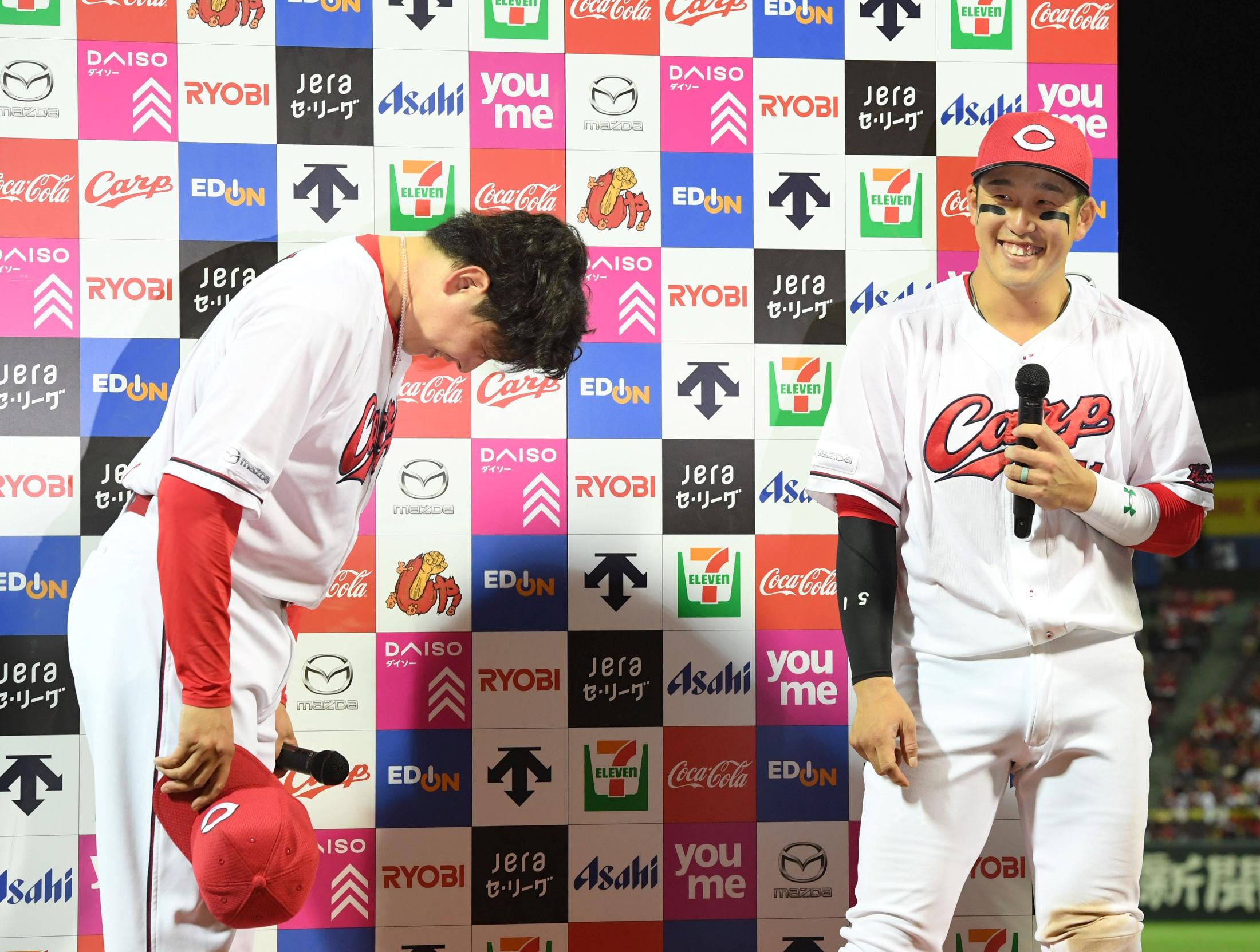 6回無失点で2勝目を挙げた大瀬良はお立ち台で並んだ小園に一礼。「うちの4番ですから。毎試合、今日もよろしくお願いしますと頭を下げてますから」と笑顔。