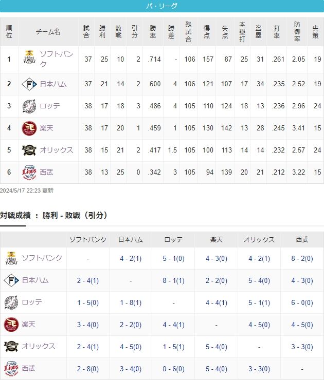 パ・リーグ順位表(5月17日)ロッテ2試合連続引き分け、SB快勝で今季最多の貯金15 スポンサーリンク 千葉ロッテマリーンズ 2024/05/18 12:04 パ・リーグ順位表(5月17日)ロッテ2試合連続引き分け、SB快勝で今季最多の貯金15 1: 名無しさん@おーぷん 24/05/17(金) 22:03:03 ID:4N2H ふい 続きを読む