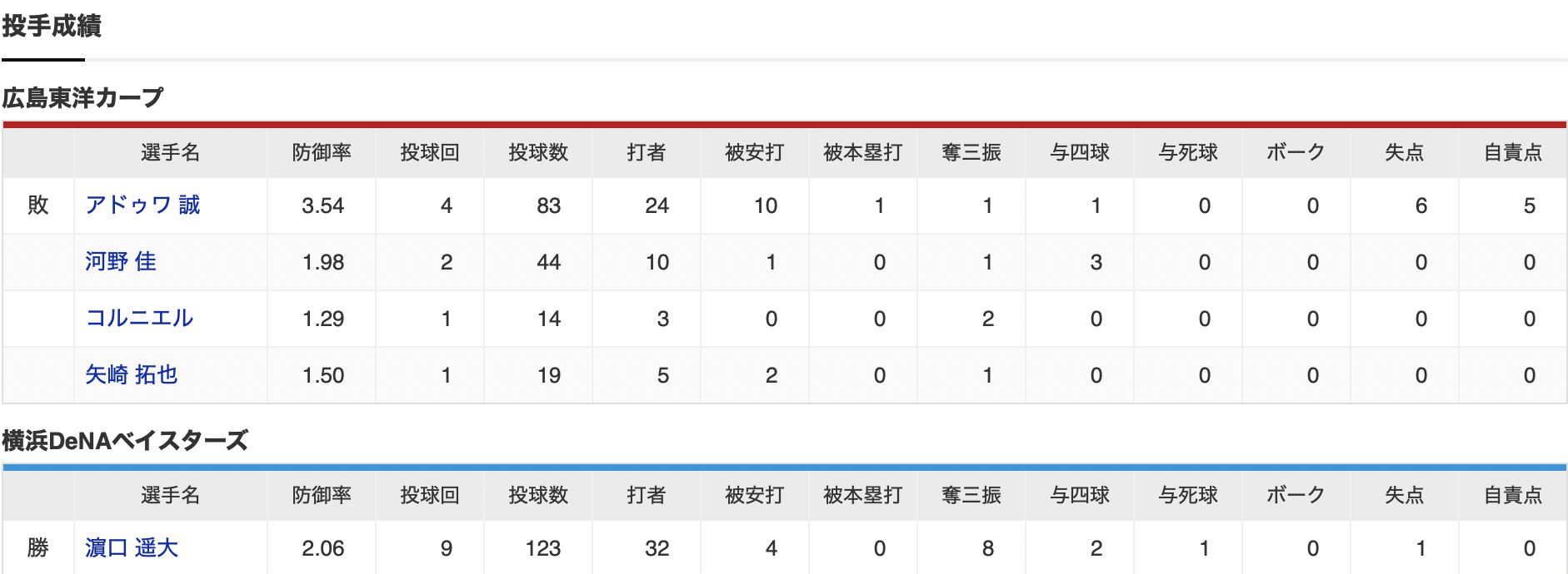 カープアドゥワ4回1被弾6失点炎上。河野-コル-矢崎は無失点リレーも濱口の前に打線沈黙。反撃は悪送球からの1得点のみ【広島1-6DeNA/試合結果】