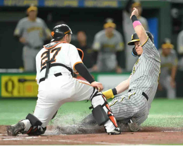 阪神・佐藤輝が足で勝利に貢献した。四回2死一、三塁の先制機。大山の左翼線への二塁打で一塁から激走し、三走・近本に続いて生還した。「(藤本三塁ベースコーチが腕を)回してたんでね。そのつもりで最初から走ってました」と胸を張った。岡田監督も「2点目が大きかった」と認めた価値ある走塁だった。