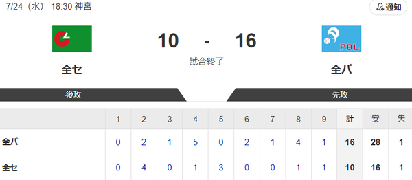 【試合結果】全セ10‐16全パ 乱打戦はパに軍配!村上2試合連続弾!吉村2失点大西4失点