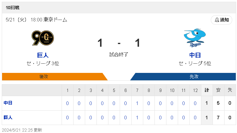 中日 0 0 0 0 0 0 1 0 0 0 0 0|1