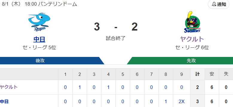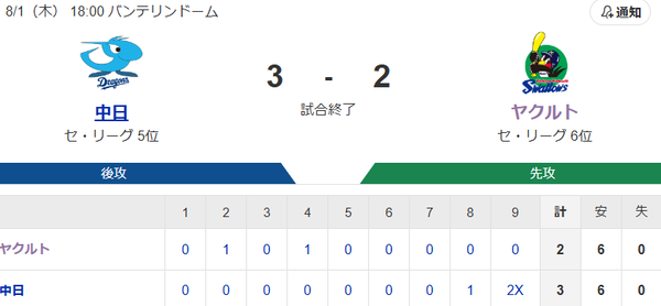 【試合結果】ヤクルト2-3×中日 9回に逆転され中日に3連敗…山田哲人8号2ラン! スポンサーリンク 東京ヤクルトスワローズ 2024/08/01 22:14 【試合結果】ヤクルト2-3×中日 9回に逆転され中日に3連敗…山田哲人8号2ラン! 42: 中1-2ヤ(9回裏) 24/08/01(木) 21:04:31 ID:ItUJ なにやってんだよ 続きを読む