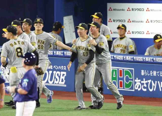 火消しをしてくれた仲間にとびっきりの笑顔を向けた。阪神・村上頌樹投手が八回途中にピンチを残して降板も、自身今季2度目の連勝で5勝目。DeNA戦は自身初勝利となった。3番手・桐敷が仕事を終えてベンチへ戻るのを白い歯をこぼし出迎えて、「野手の皆さんが逆転してくれて、リリーフの方も抑えてくれて、みんなに助けられた」と感謝の白星となった。