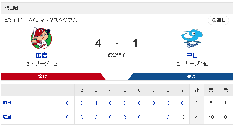 広島 0 0 0 0 3 0 1 0 X |4