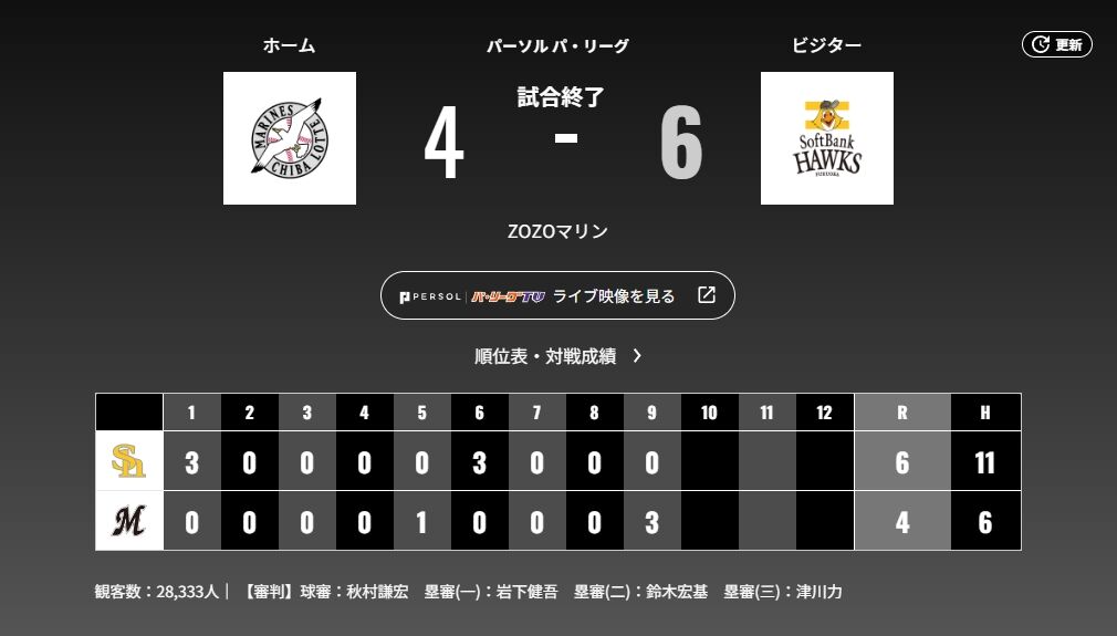 8月6日 ロッテ4-6ソフトバンク 先発小島が6回途中6失点、最終回にポランコの一発で2点差まで迫るも及ばず敗戦 スポンサーリンク 千葉ロッテマリーンズ 2024/08/07 00:23 8月6日 ロッテ4-6ソフトバンク 先発小島が6回途中6失点、最終回にポランコの一発で2点差まで迫るも及ばず敗戦 804: どうですか解説の名無しさん 2024/08/06(火) 21:27:10.99 ID:Dl9paOcH0 最後に楽しめてよかったね ※GIF画像 続きを読む