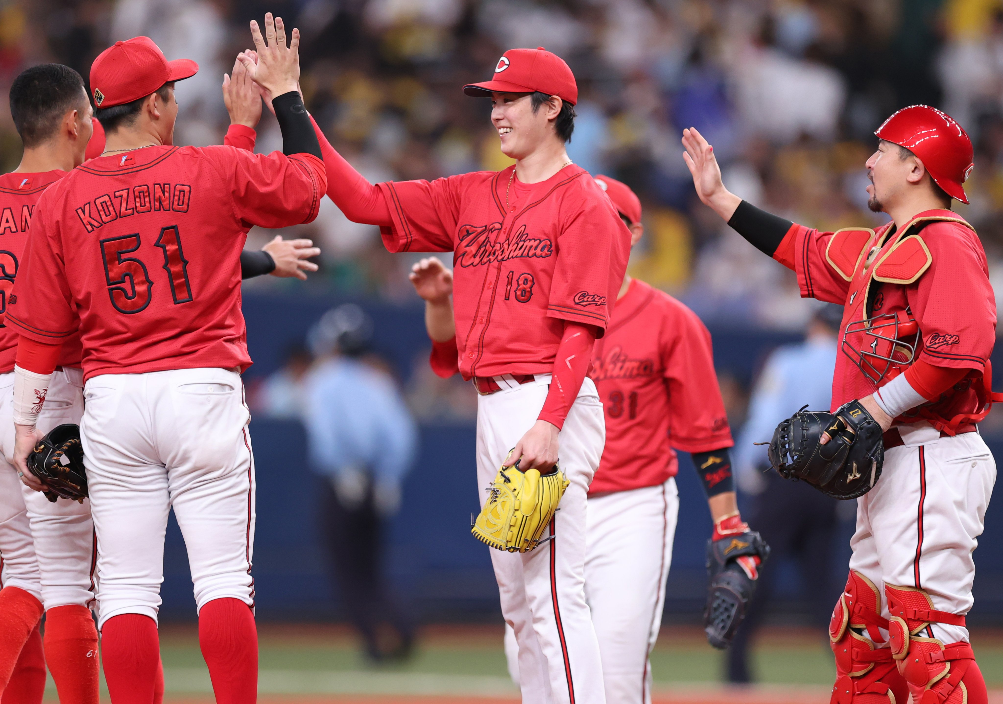 完投勝利を挙げてナインと笑顔でハイタッチをかわす #森下暢仁 投手