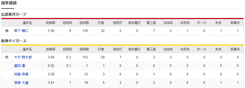 広島阪神_森下暢仁_大竹耕太郎_スコア