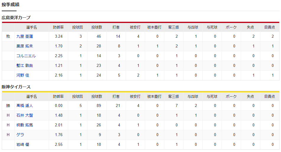 カープ今季17度目完封負け。九里3回2失点KO。矢野猛打賞で反撃も髙橋遥人に1025日ぶり白星献上【広島0-4阪神/試合結果】