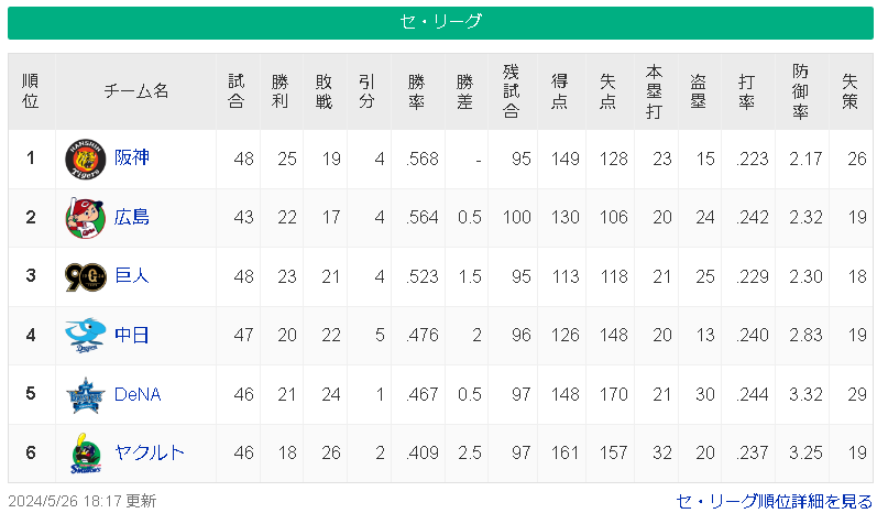 【5/26】神-広=-巨=/=中-横==-ヤ【順位スレ】